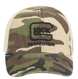 The Glock Men's Declare Mesh Hat is constructed of 100% cotton with an adjustable Velcro strap. This hat features the Glock Perfection logo on the front with a desert camo background. The rear of the hat is a breathable mesh material with an American flag patch on the left side.
