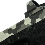A fresh take on the Glock 34. This Glock 34 features the Combat Seeker slide cuts. The serrations are cut behind the lightening cuts allowing for more modern slide manipulation options. With its longer sight radius, Agency Arms barrel and the Leupold Deltapoint Pro this Glock 34 is a very accurate setup. To increase that Look Cool Factor (LCF) it is finished in a hexagonal camouflage.
